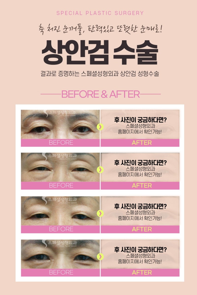 깨어나는 기능이 개선되어 이마로 눈을 뜨지 않아도 되므로 자연스럽게 있을 수 있게 되어 온화한 인상으로 개선 효과를 기대할 수 있습니다. 다음과 같은 분들은 상안검 성형의 효과를 기대할 수 있습니다. 눈꺼풀 처짐으로 쌍꺼풀이 가려져 눈이 작아 보이는 것인 눈꺼풀이 처져 시야가 답답해 보이고 속눈썹이 자주 눈을 찌르는 눈을 뜨기 힘들고 이마 주름, 표정 주름이 심하다.눈가에 잔주름이 통통하고 미적으로 좋지 않은 눈 밑 지방이 부풀어 심술궂게 보여 걱정이다 눈밑 주름과 곰으로 가만히 있어도 피곤해 보인다는 말을 자주 듣는 바나나의 상안검 수술