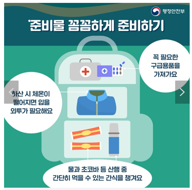– 등반 전 준비 : 등반 전 목적지와 날씨를 확인하고 필요한 장비와 복장을 준비한다. 하이킹 신발, 모자, 장갑 등은 필수품이며 비상약, 음식, 물도 필수입니다. 또한 자신의 지구력과 난이도에 맞는 코스를 선택하고 걷기 전 스트레칭을 한다.