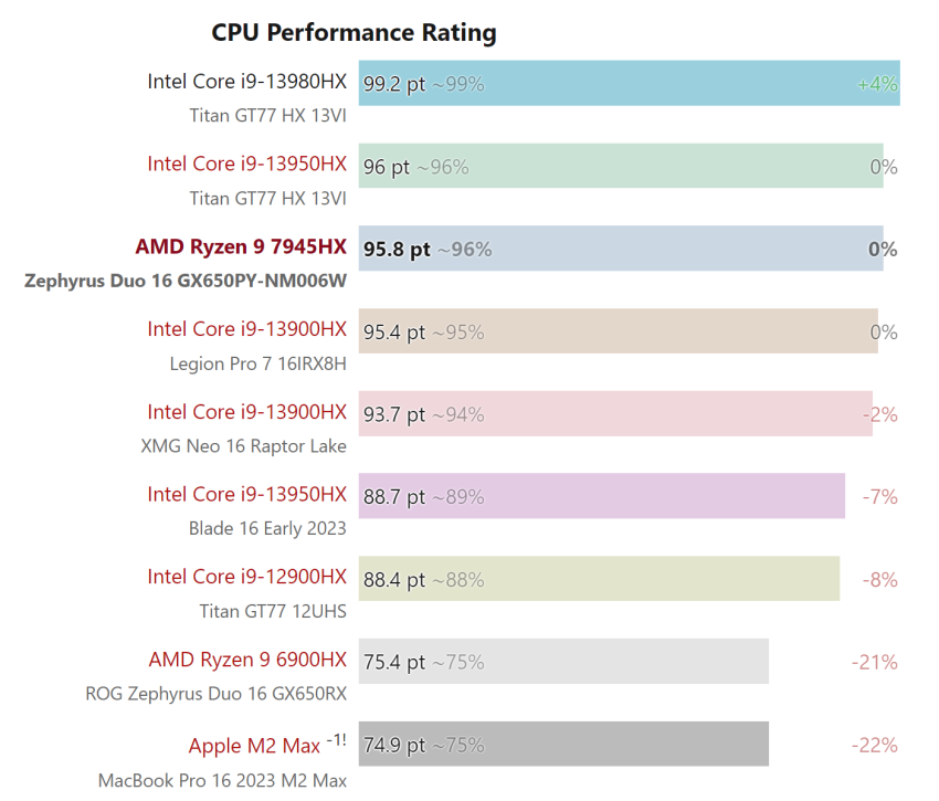 종합 결과에 따르면 7045 시리즈의 플래그십인 라이젠 9 7945HX는 싱글코어 테스트에서 인텔의 플래그십 코어 i9-13980HX CPU와 거의 비슷한 속도, 멀티코어 테스트에서는 거의 비슷한 속도를 보였다. 두 프로세서는 최대 5%의 간격으로 두 클래스에서 자리를 바꿉니다.