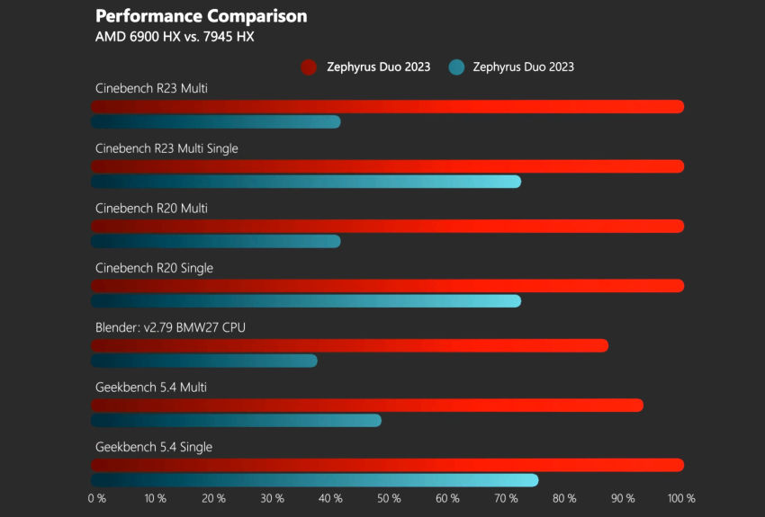 또한 이 CPU는 2022년에 출시된 동일한 ASUS ROG Duo 노트북으로 테스트한 이전 세대 Ryzen 9 6900HX Rembrandt Zen3+ SKU보다 훨씬 빠릅니다.