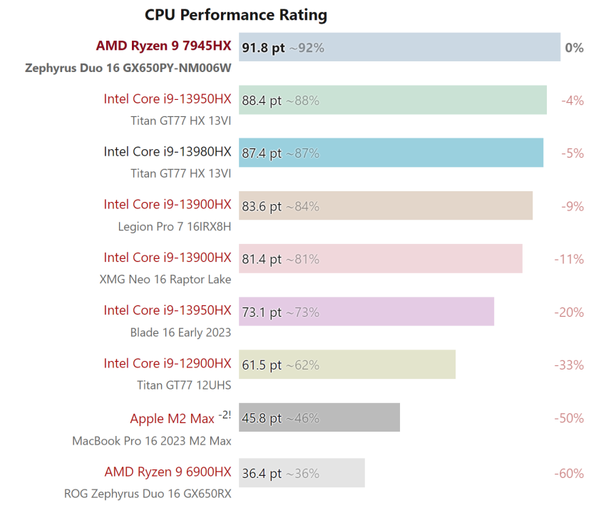 종합 결과에 따르면 7045 시리즈의 플래그십인 라이젠 9 7945HX는 싱글코어 테스트에서 인텔의 플래그십 코어 i9-13980HX CPU와 거의 비슷한 속도, 멀티코어 테스트에서는 거의 비슷한 속도를 보였다. 두 프로세서는 최대 5%의 간격으로 두 클래스에서 자리를 바꿉니다.